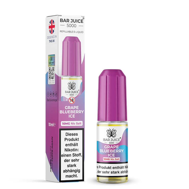 Du suchst ein intensives, fruchtiges Nikotinsalz-Liquid mit richtig guter Ice-Note? Bar Juice 5000 Grape Blueberry Ice kombiniert saftige Traube mit vollmundiger Blaubeere und einem klaren, eisigen Cooling-Finish – perfekt für alle, die es süß, beerig und erfrischend mögen. 😮💨✨