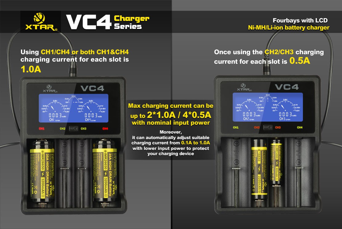 Das XTAR VC4 erkennt automatisch sowohl Li-Ion- als auch NiMH-Akkus und passt den Ladevorgang entsprechend an. Das große LCD-Display liefert Ihnen umfassende Informationen in Echtzeit: